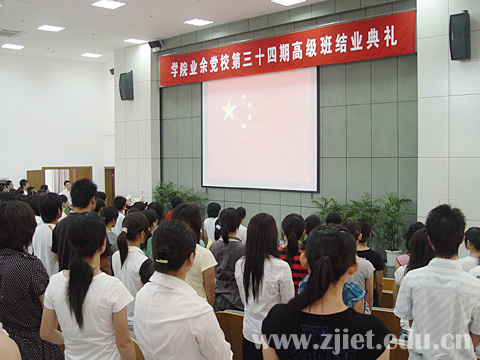 2007年6月21日,学院业余党校第34期高级班结业典礼在图书馆报告厅举行。院党委组织部沈贵林老师、院党委宣传部副部长潘春胜老师、院团委书记吴刚群老师和各系党总支书记、学生党支部书记、团委副书记及学生代表出席结业典礼。典礼由业余党校34期高级班班主任裘永晓老师主持。