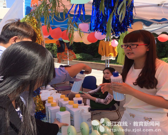 “快来买我们的产品吧,使用效果包你满意!”当记者在各个展位间徘徊时,被一位安利洗护用品展位的女“老板”热情地招呼了过去。这位女“老板”是国贸系的大一女生杨婷婷。当记者表示对产品效果不甚了解后,杨婷婷十分热情地表示可以通过做个小实验,“看看安利的洗洁产品与普通产品有什么不同。”随即,她拿起了两个勺匙做起了试验。在她殷勤地演示和推荐下,记者满意地掏出一张“现金支票”,将产品买下。随后,一位在旁观望已久的外国友人,看完杨婷婷的演示,也凑上来询问产品功效。“let me have a simple introduction for you”杨婷婷立马瞅准机会,用英语向老外做起了产品推销。