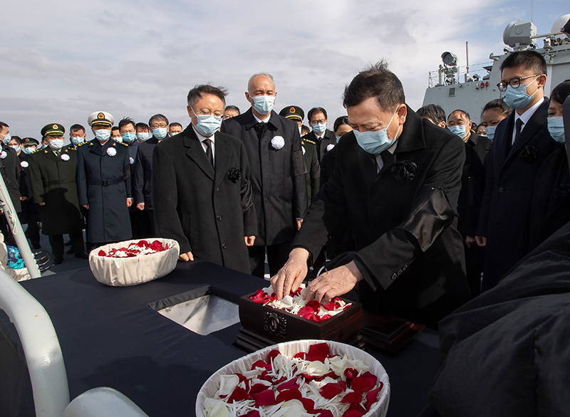12月11日,遵照江泽民同志及其亲属的意愿,敬爱的江泽民同志的骨灰在长江入海口撒入大海。受党中央委托,中共中央政治局常委、中央书记处书记蔡奇等领导同志和江泽民同志的夫人王冶坪等亲属护送骨灰撒放。新华社记者 李涛 摄