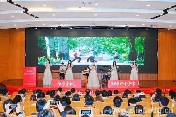 学弟学妹们准备了丰富多彩的节目与校友欢聚一堂,开场舞《闪耀》欢快活泼的音乐缭绕会场,轻快明亮的身影跃动舞台,拨动了全场的心弦。歌曲组合《凤凰花开的路口》,用歌声唱出祝福,用歌声表达心声,展现了新时代大学生奋发向上的积极风貌。最后全体师生同唱一首歌《新时代的经贸人》,追忆青春,共展未来。